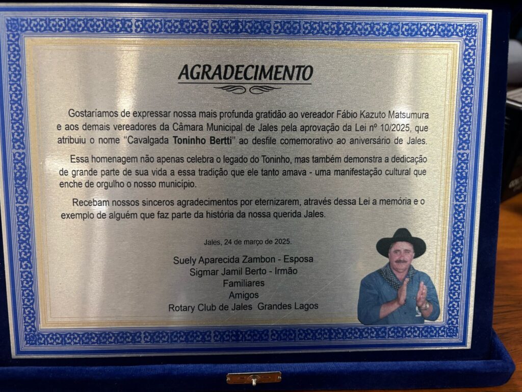 Por meio do Projeto de Lei nº 10/2025, o vereador Fábio Kazuto Matsumura propôs dar o nome de “Toninho Bertti” à cavalgada anual realizada no mês de abril, em celebração ao aniversário de Jales. A propositura foi aprovada unanimemente.