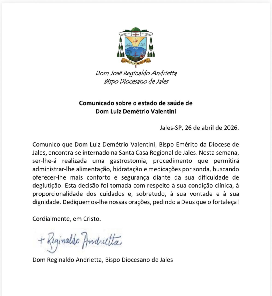 De acordo com a nota oficial emitida pela Diocese e assinada pelo bispo Dom Reginaldo Andrietta, na manhã deste domingo (26), será realizado nesta semana um procedimento de gastrostomia. O que permitirá administrar-lhe alimentação, hidratação e medicações por sonda, buscando oferecer-lhe mais conforto e segurança diante da sua dificuldade de deglutição. Esta decisão foi tomada com respeito à sua condição clínica, à proporcionalidade dos cuidados e, sobretudo, à sua vontade e à sua dignidade. Dediquemos-lhe nossas orações, pedindo a Deus que o fortaleça! Finaliza a nota.