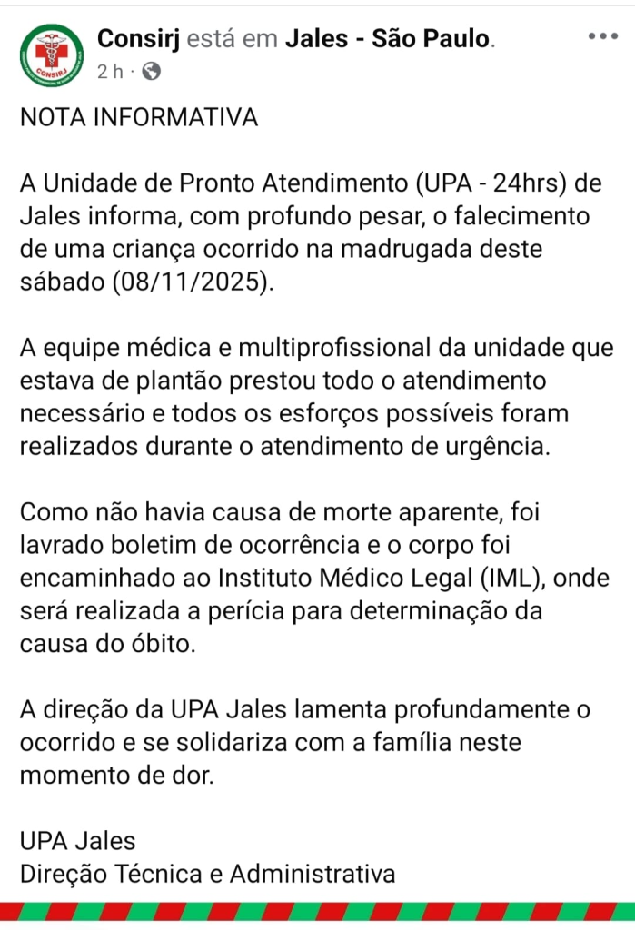A direção do Consórcio Público Intermunicipal de Saúde da Região de Jales (Consirj) que administra a UPA emitiu Nota Informativa: