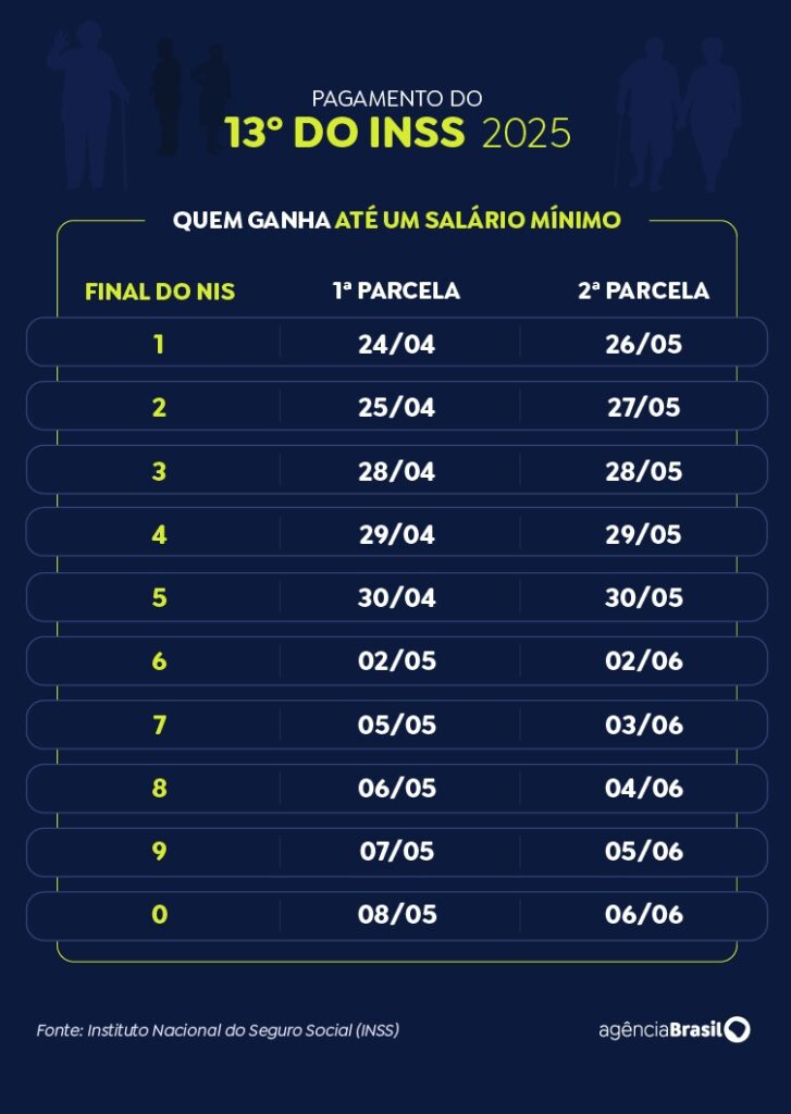 O presidente Luiz Inácio Lula da Silva assinou o decreto de antecipação do 13º de aposentados e pensionista do Instituto Nacional do Seguro Social (INSS), como feito em outros anos. A primeira parcela será paga de 24 de abril a 8 de maio. A segunda parcela vai de 26 de maio a 6 de junho. As datas são definidas com base no dígito final do Número de Inscrição Social (NIS) e com base na renda do beneficiário. Quem ganha apenas o salário mínimo começa a receber antes de quem recebe mais que o mínimo.