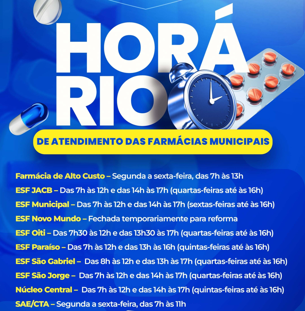 A Prefeitura de Jales, por meio da Secretaria Municipal de Saúde, informa à população os horários de atendimento das farmácias municipais e reforça a importância de que os munícipes fiquem atentos aos dias e períodos de funcionamento de cada unidade.