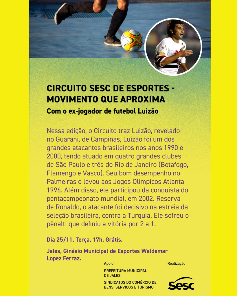 A cidade de Jales/SP será palco, no dia 25 de novembro, de uma tarde especial dedicada ao esporte e à integração comunitária. O “Circuito SESC de Esportes – Movimento que Aproxima” traz ao município o ex-jogador Luizão, um dos destaques do futebol brasileiro nos anos 1990 e 2000, para uma atividade aberta ao público.