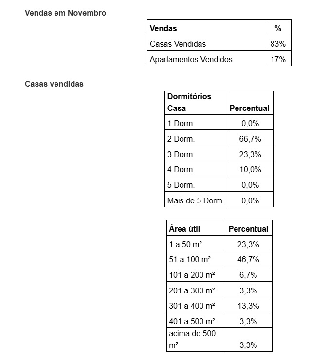 A maioria das casas era de 2 dormitórios com 100 até 200 m² de área útil.