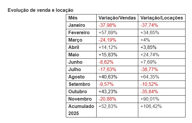 “Em contrapartida, o segmento de locação apresentou desempenho expressivo, com crescimento de 90,01% no mês e avanço acumulado acima de 100% em 2025. A procura concentrou-se em casas de dois dormitórios, com aluguéis de até R$ 1.500, localizadas principalmente em regiões periféricas, refletindo a busca por preços mais acessíveis. O uso predominante do seguro-fiança indica maior profissionalização das relações locatícias e atenção à segurança jurídica. Esses dados confirmam a resiliência do mercado imobiliário da região e a importância da atuação qualificada do corretor de imóveis para orientar compradores, vendedores, locadores e locatários em um cenário de constantes ajustes.”