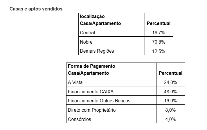 Com relação às modalidades de venda, 48% foram financiadas pela CAIXA, 16% por outros bancos, 8% diretamente pelos proprietários, 24% dos negócios foram fechados à vista e por consórcios, 4% no período.