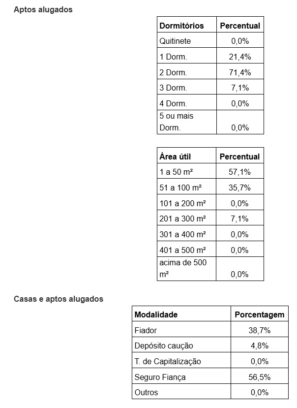 E daqueles que encerraram os contratos de locação, 4,8% optaram por aluguéis mais baratos, 0% por aluguéis mais caros e 95,2% não justificaram o motivo da mudança.