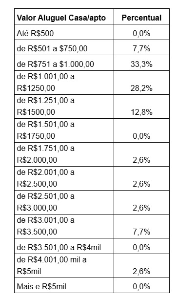 A faixa de preço de locação de preferência dos inquilinos de casas e apartamentos ficou até R$ 1.500,00.