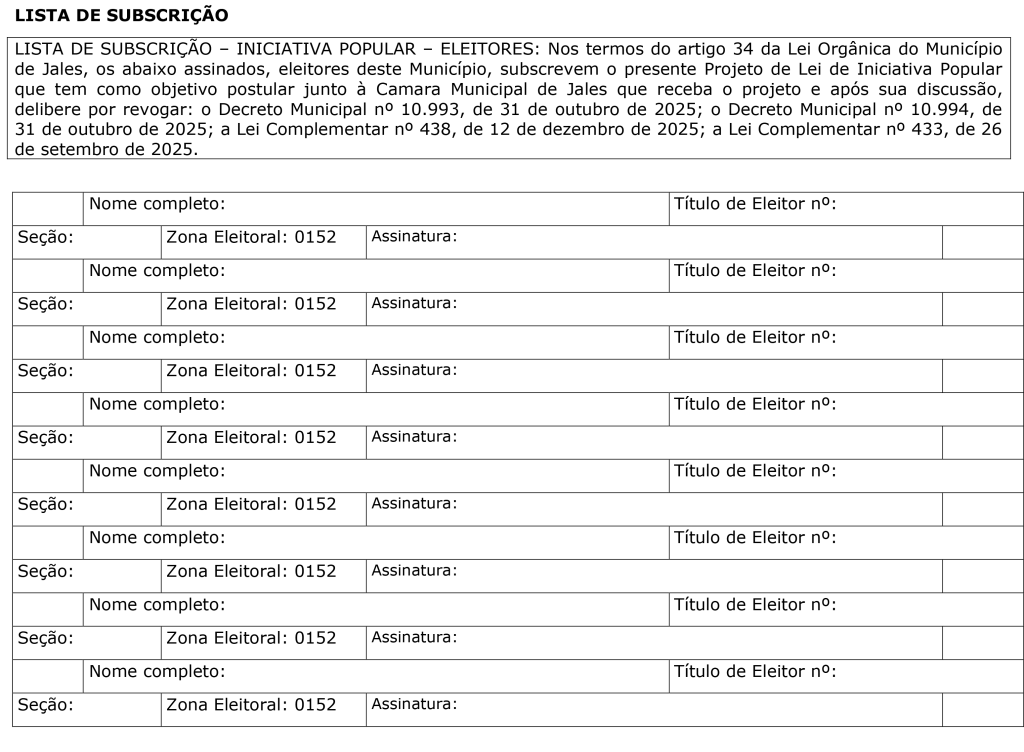 Em entrevista concedida no estúdio do Canal 12, na tarde de sexta-feira, 9 de dezembro, o advogado Carlos Alberto Britto Neto explicou sobre o Projeto de Lei de Iniciativa Popular em Jales/SP, que pauta sobre as cobranças do IPTU, ITBI e Taxa de Licenciamento e Fiscalização de Localização e Funcionamento – Exercício de 2026 – Projeto de Lei de Iniciativa Popular – Revogação de Decretos e Leis Complementares.