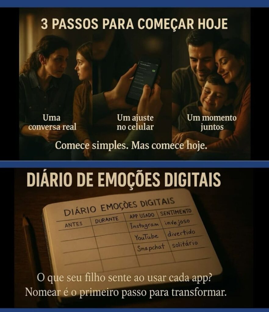 • Diário de Emoções Digitais: ferramenta para que crianças e adolescentes expressem seus sentimentos após o uso de redes sociais, promovendo o autoconhecimento emocional.