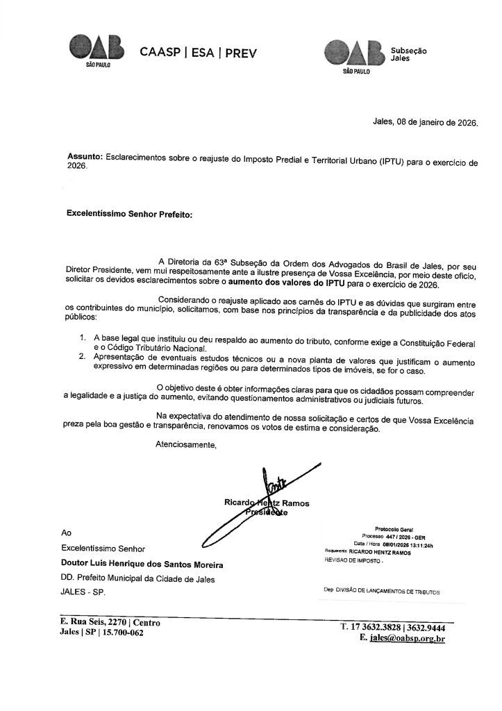 Na manhã de sexta-feira, 9 de dezembro, Ricardo Hentz Ramos, presidente da OAB Jales – 63ª Subseção (Ordem dos Advogados do Brasil), esteve no estúdio do Canal 12 para explicar a motivação do ofício endereçado a Prefeitura, sobre esclarecimentos do aumento do IPTU. Confira o vídeo na íntegra: