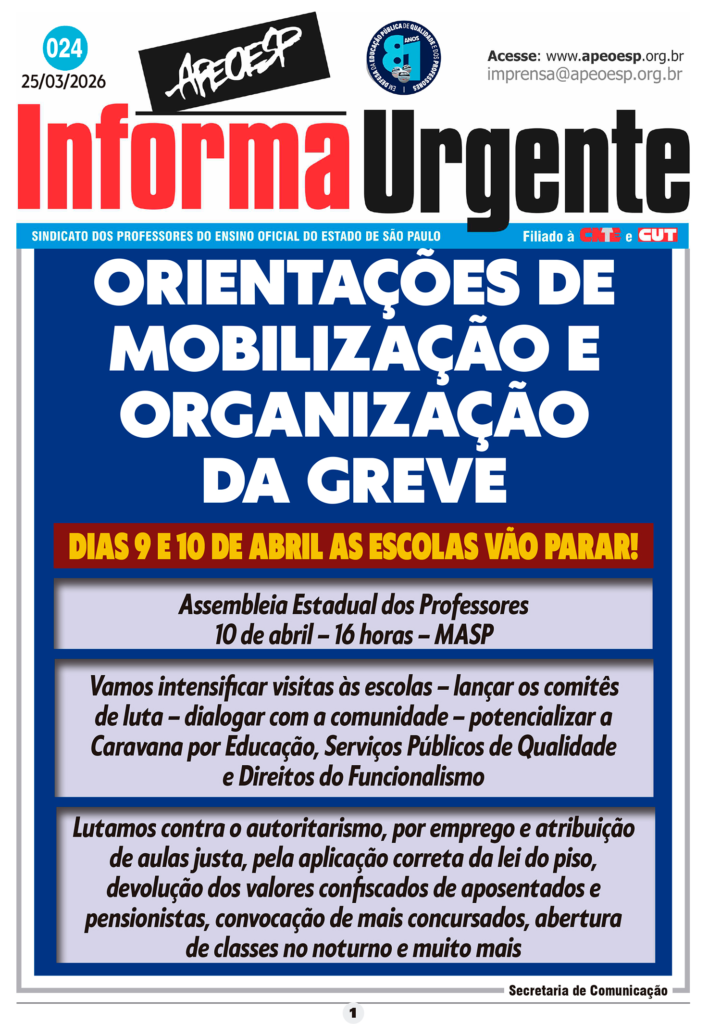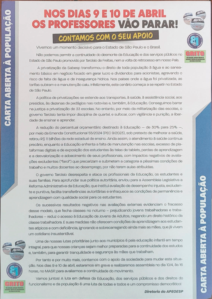 Os docentes da rede estadual de São Paulo anunciaram uma greve nos dias 9 e 10 de abril, resultando na suspensão das atividades escolares. A APEOESP, entidade que representa a categoria no estado, está organizando a mobilização, que inclui uma assembleia no MASP no dia 10.