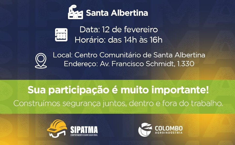 A Colombo Agroindústria promove a Semana Interna de Prevenção de Acidentes de Trabalho e Meio Ambiente (SIPATMA) na próxima quinta-feira, 12 de fevereiro, das 14h às 16h, no Centro Comunitário de Santa Albertina/SP.